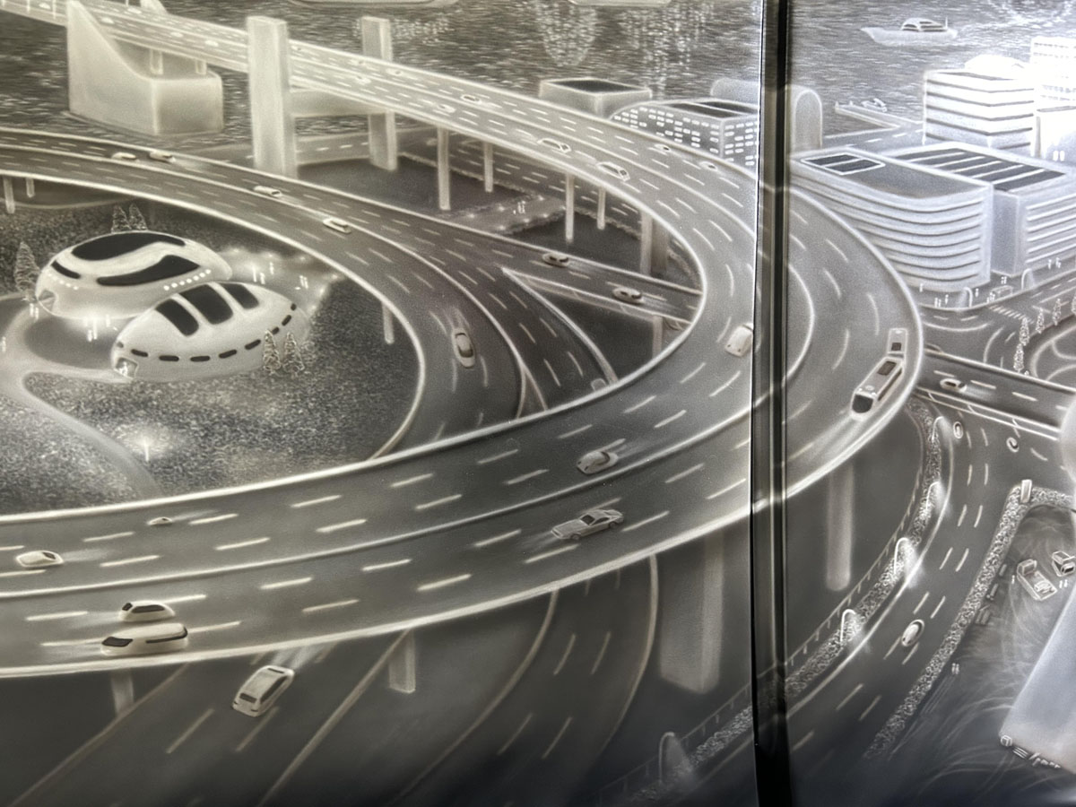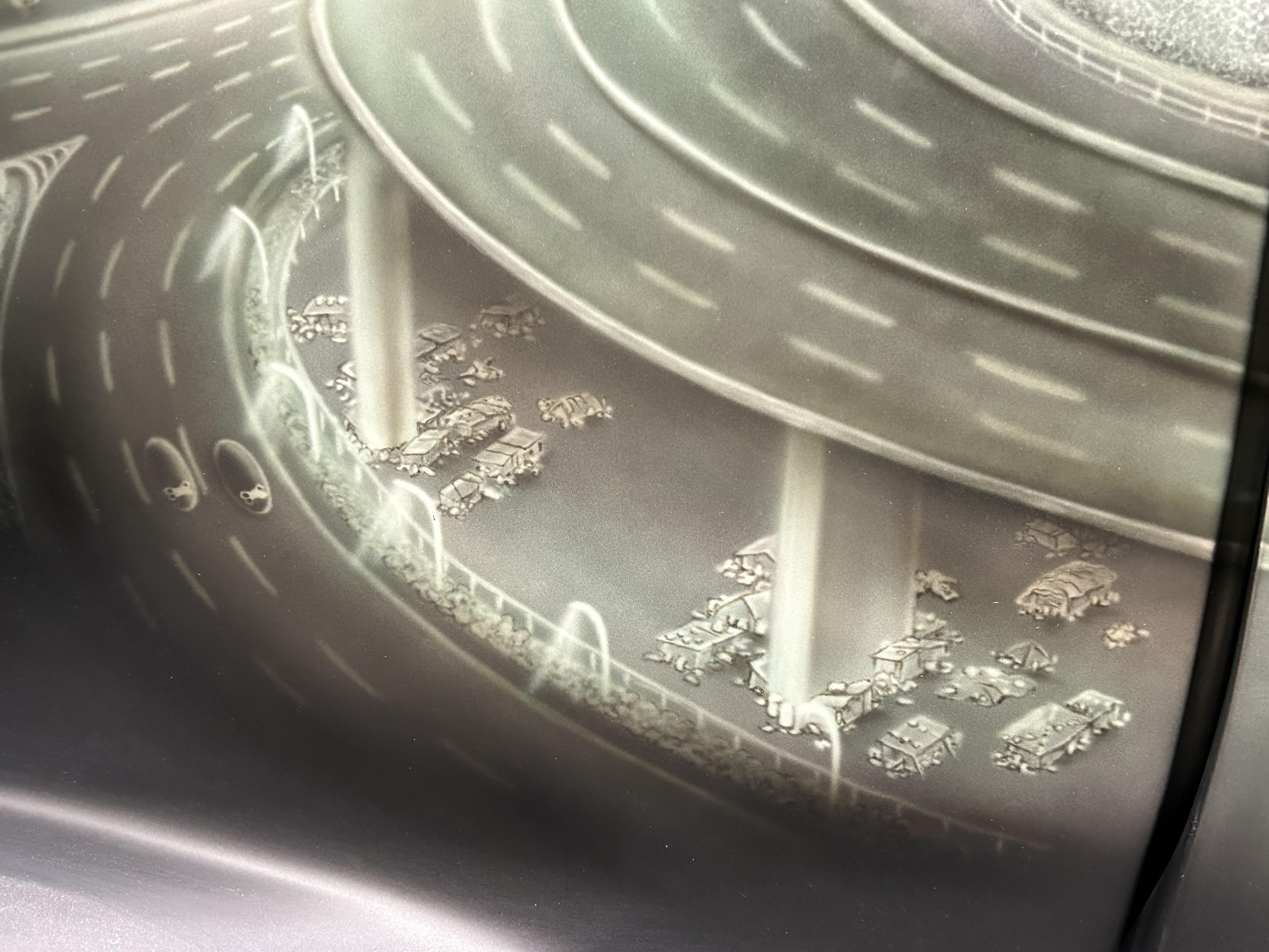 ここからは制作途中を(^^) ここまで描いた時にドアの継ぎ目に高速道路のアールのいい部分がかかってしまう事に気付いて、泣く泣く全消しして全体を3cm左へずらして描き直しました、、、(;;)